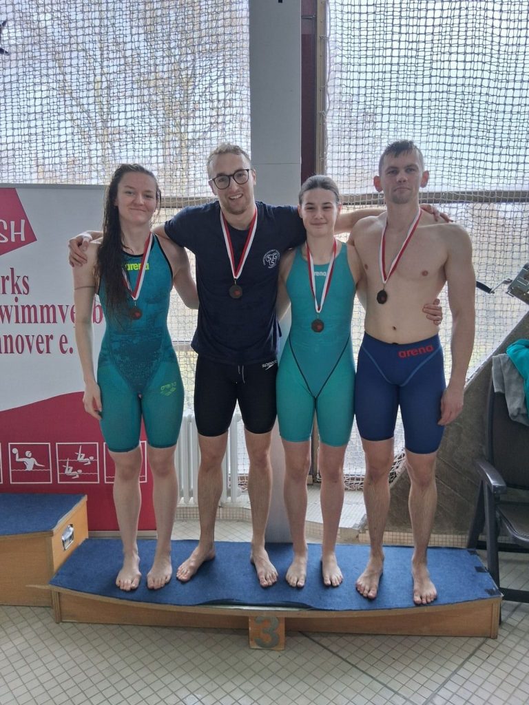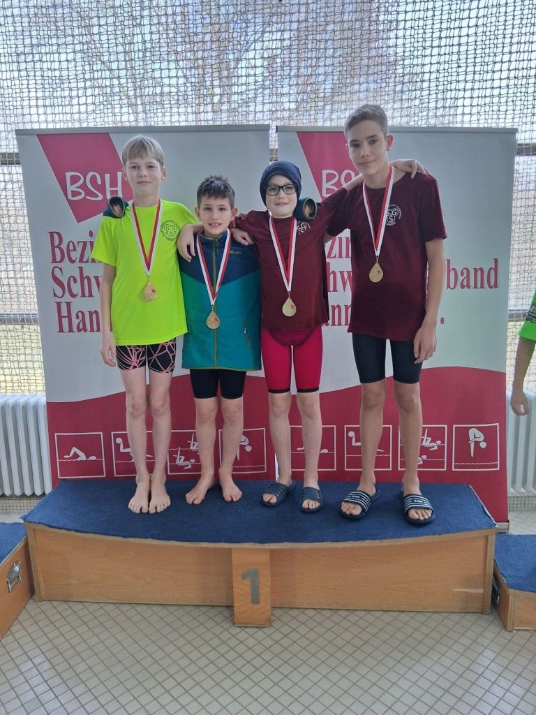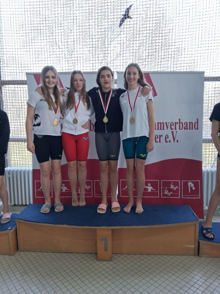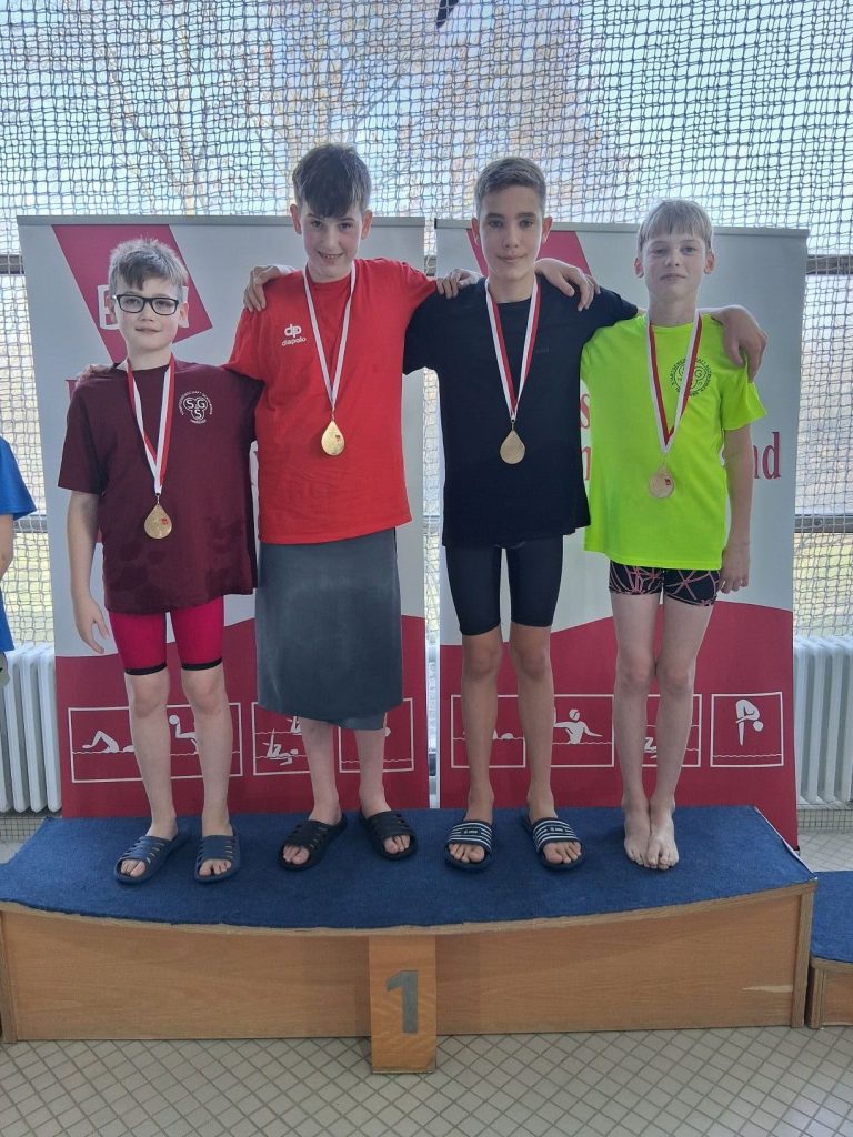 Selbst in den Staffeln wurden fleißig Medaillen gesammelt. Die junge 4x50m Lagenstaffel des JG 2013-2016, zuerst weiblich mit Nina Maria Reusch, Luisa Schulze, Tamara Teige und Joline Topper holten in 02:17,05 min die erste Goldmedaille für die SGS. Dies machten die Jungs auch gleich nach. Mit Maxim Neb, Manuel Gamm, Kasimir Abdic und Leonard Lokschin schnappten sie sich hauchdünn mit 0,30s Vorsprung mit einer Zeit von 02:28,45 min ebenso Gold.