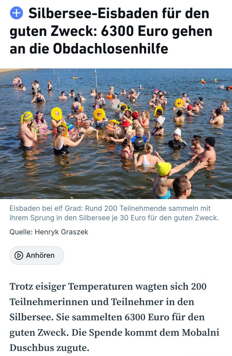 Beim „Eisbaden für den guten Zweck“ am Silbersee in Langenhagen wurde nicht nur gebadet, sondern auch Großartiges geleistet: Für jeden Teilnehmer spendet die Peter-Jensen-Stiftung 30€ an den Mobalni Duschbus Hannover – für mehr Hygiene und Würde im Alltag.